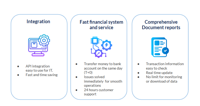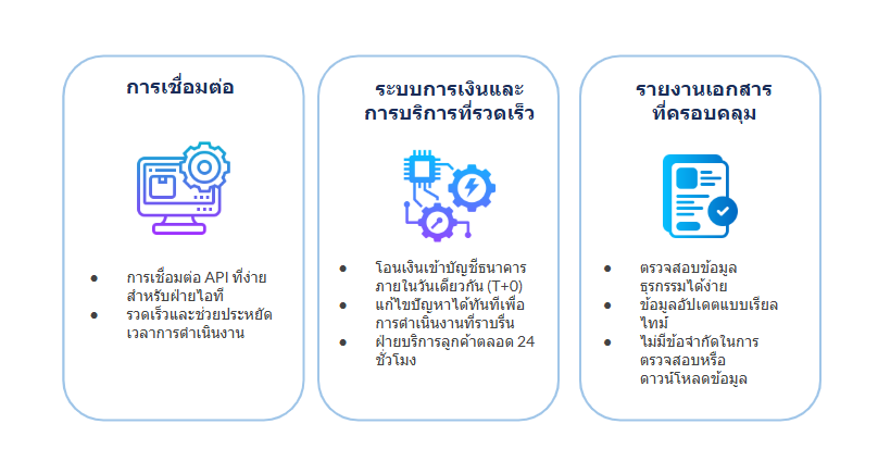 เรามุ่งเน้นการสนับสนุน เสริมศักยภาพให้กับธุรกิจและบุคคล ช่วยอำนวยความสะดวก ให้ลูกค้าเติบโตทางธุรกิจ ด้วยเทคโนโลยีการชำระเงินที่ทันสมัย พร้อมด้วยการให้บริการที่โปร่งใส รวดเร็ว และปลอดภัย